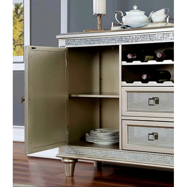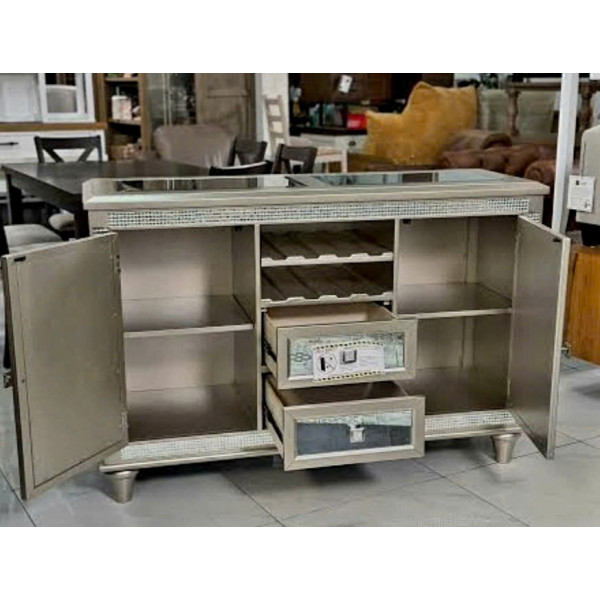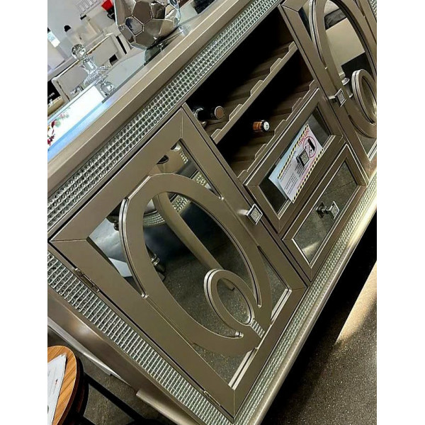 Điểm nhấn gạch gương tạo thêm nét quyến rũ và tinh tế với chân tủ tiện lợi, mang đến sự ổn định và nét cổ điển, đồng thời là nơi cất giữ rượu vang tiện lợi và phong cách với lớp sơn phủ màu bạc, toát lên vẻ sang trọng, quyến rũ hiện đại và phong cách đương đại thanh lịch với điểm nhấn cổ điển.